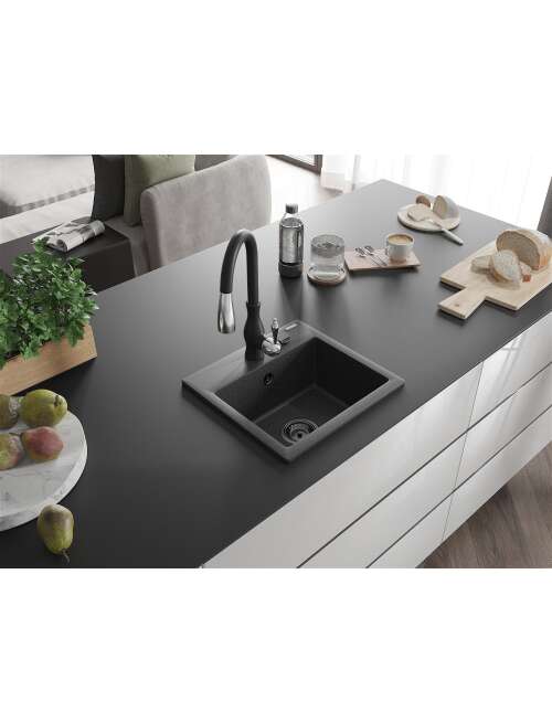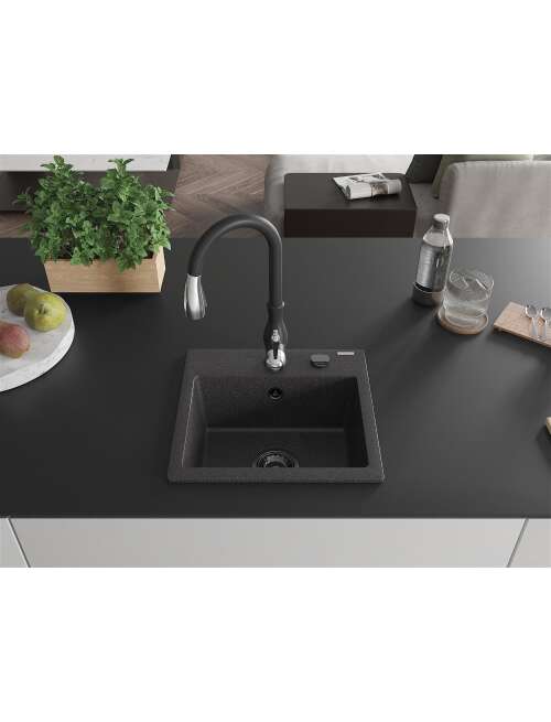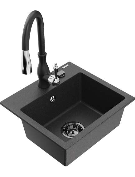 Dane techniczne: Zlewozmywak: Rozmiar: 435x410x171 mm Głębokość komory: 161 mm Wymiary komory: 375x280 mm Średnica odpływu: ø90 mm Typ: 1-komorowy Rodzaj: Wpuszczany w blat Kolor: Czarny nakrapiany Wykończenie syfonu: Czarny Materiał: Granit (80% kruszywo granitowe 20% żywice) Otwór przelewowy: Tak Otwory: ( bateria, automat ) 2 Wysoka odporność na zarysowania i przebarwienia Odporność na szok termiczny Powierzchnia ułatwiająca czyszczenie Jeden dodatkowy podfrezowany otwór do samodzielnego wybicia ø35 Bateria kuchenna: Materiał: Mosiądz Kolor: Czarny Głowica: Ceramiczna Perlator: Tak Typ: Jednouchwytowa Wysokość baterii: 410 mm Zasięg wylewki: 231 mm |