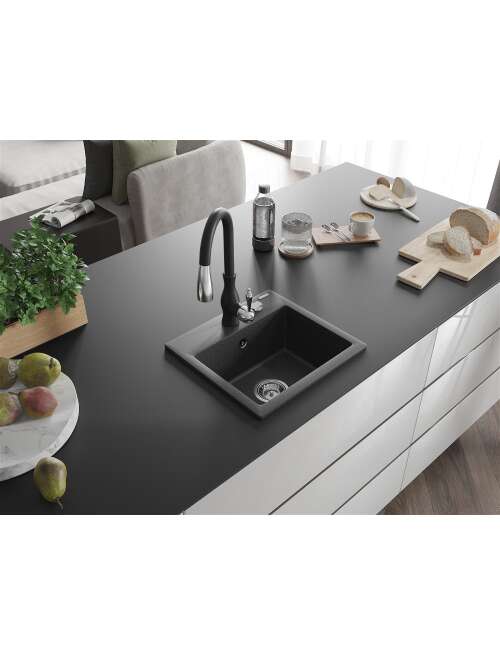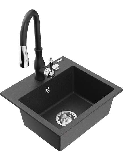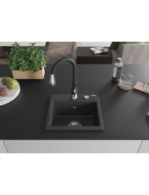Dane techniczne: Zlewozmywak: Rozmiar: 435x410x171 mm Głębokość komory: 161 mm Wymiary komory: 375x280 mm Średnica odpływu: ø90 mm Typ: 1-komorowy Rodzaj: Wpuszczany w blat Kolor: Czarny nakrapiany Wykończenie syfonu: Chrom Materiał: Granit (80% kruszywo granitowe 20% żywice) Otwór przelewowy: Tak Otwory: ( bateria, automat ) 2 Wysoka odporność na zarysowania i przebarwienia Odporność na szok termiczny Powierzchnia ułatwiająca czyszczenie Jeden dodatkowy podfrezowany otwór do samodzielnego wybicia ø35 Bateria kuchenna: Materiał: Mosiądz Kolor: Czarny Głowica: Ceramiczna Perlator: Tak Typ: Jednouchwytowa Wysokość baterii: 410 mm Zasięg wylewki: 231 mm |
