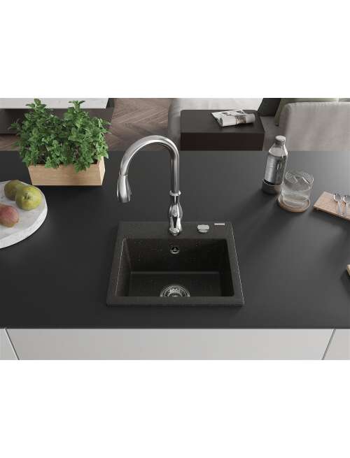 Mexen Milo zlewozmywak granitowy 1-komorowy z baterią kuchenną Savita, czarny/złoty metalik- 6505-75-672601-00