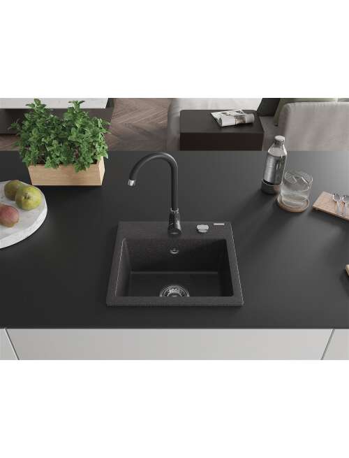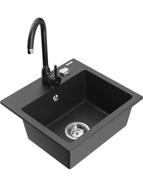 Dane techniczne: Zlewozmywak: Rozmiar: 435x410x171 mm Głębokość komory: 161 mm Wymiary komory: 375x280 mm Średnica odpływu: ø90 mm Typ: 1-komorowy Rodzaj: Wpuszczany w blat Kolor: Czarny nakrapiany Wykończenie syfonu: Chrom Materiał: Granit (80% kruszywo granitowe 20% żywice) Otwór przelewowy: Tak Otwory: ( bateria, automat ) 2 Wysoka odporność na zarysowania i przebarwienia Odporność na szok termiczny Powierzchnia ułatwiająca czyszczenie Jeden dodatkowy podfrezowany otwór do samodzielnego wybicia ø35 Bateria kuchenna: Materiał: Mosiądz Kolor: Czarny Głowica: Ceramiczna Perlator: Tak Typ: Jednouchwytowa Wysokość baterii: 335 mm Zasięg wylewki: 180 mm |