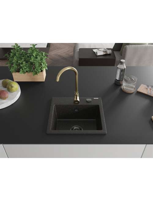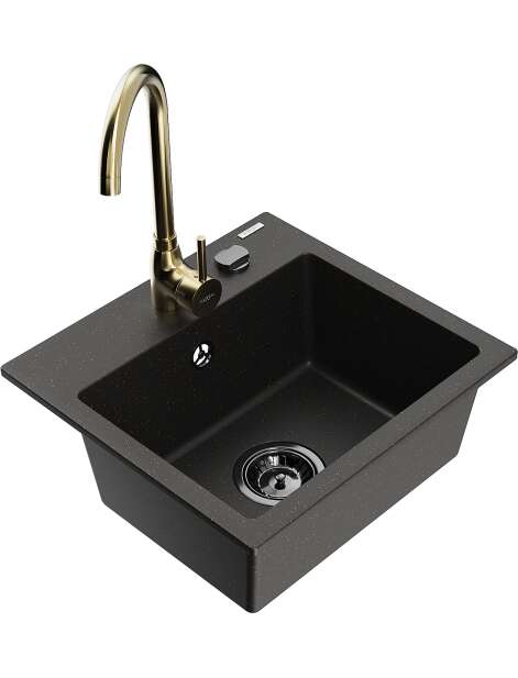 Dane techniczne: Zlewozmywak: Rozmiar: 435x410x171 mm Głębokość komory: 161 mm Wymiary komory: 375x280 mm Średnica odpływu: ø90 mm Typ: 1-komorowy Rodzaj: Wpuszczany w blat Kolor: Czarny/Złoty metalik Wykończenie syfonu: Czarny Materiał: Granit (80% kruszywo granitowe 20% żywice) Otwór przelewowy: Tak Otwory: ( bateria, automat ) 2 Wysoka odporność na zarysowania i przebarwienia Odporność na szok termiczny Powierzchnia ułatwiająca czyszczenie Jeden dodatkowy podfrezowany otwór do samodzielnego wybicia ø35 Bateria kuchenna: Materiał: Mosiądz Kolor: Złoty Głowica: Ceramiczna Perlator: Tak Typ: Jednouchwytowa Wysokość baterii: 335 mm Zasięg wylewki: 180 mm |