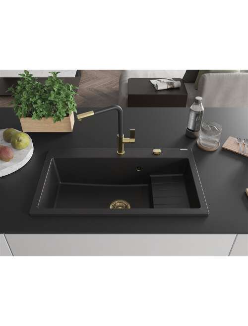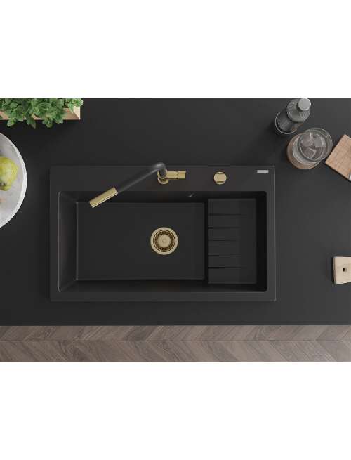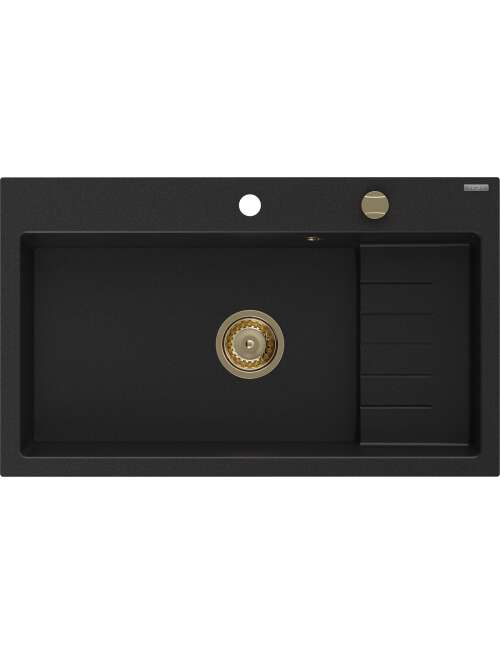 Specyfikacja produktu:Rozmiar: 800x480x210 mm Głębokość komory: 200 mm Wymiary komory: 734x357 mm Średnica odpływu: ø90 mm Rodzaj: 1-komorowy Typ: Wpuszczany w blat Materiał: Granit Kolor: Czarny Wykończenie syfonu: Złoty Otwór przelewowy: Tak Otwór na baterie: Tak Syfon automatyczny w komplecie Wysoka odporność na zarysowania i przebarwienia Odporność na szok termiczny Powierzchnia ułatwiająca czyszczenie Jeden dodatkowy podfrezowany otwór do samodzielnego wybicia ø35 |