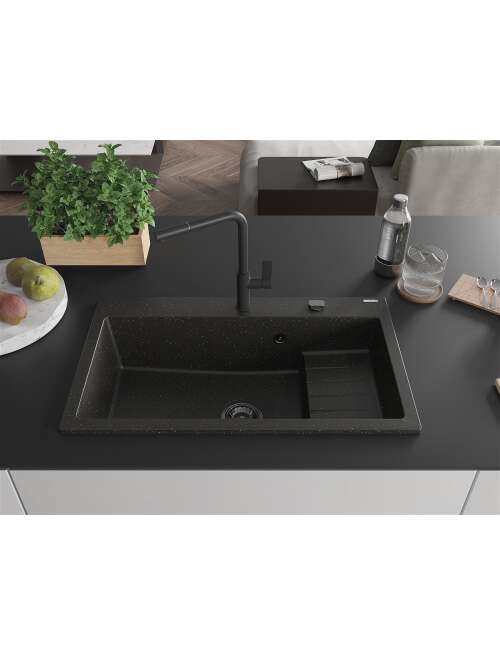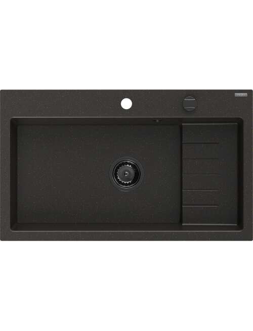 Specyfikacja produktu:Rozmiar: 800x480x210 mm Głębokość komory: 200 mm Wymiary komory: 734x357 mm Średnica odpływu: ø90 mm Rodzaj: 1-komorowy Typ: Wpuszczany w blat Materiał: Granit Kolor: Czarny/Złoty metalik Wykończenie syfonu: Czarny Otwór przelewowy: Tak Otwór na baterie: Tak Syfon automatyczny w komplecie Wysoka odporność na zarysowania i przebarwienia Odporność na szok termiczny Powierzchnia ułatwiająca czyszczenie Jeden dodatkowy podfrezowany otwór do samodzielnego wybicia ø35 |