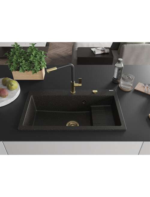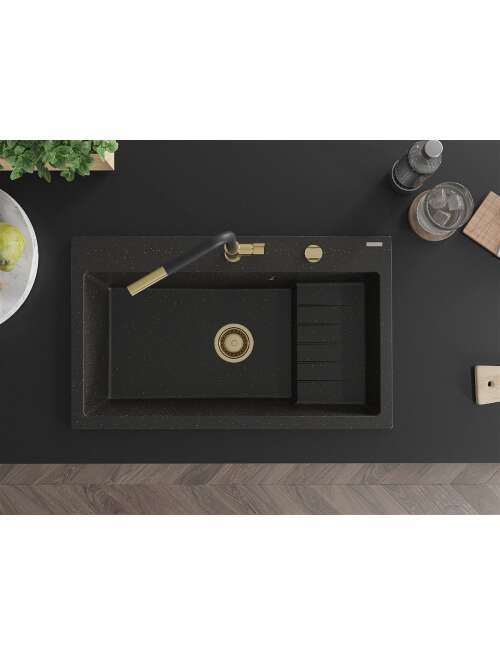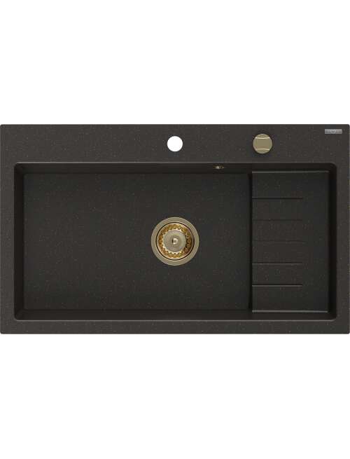 Mexen Omar zlewozmywak granitowy 1-komorowy 800 x 480 mm, czarny/złoty metalik, syfon złoty - 6520801005-75-G