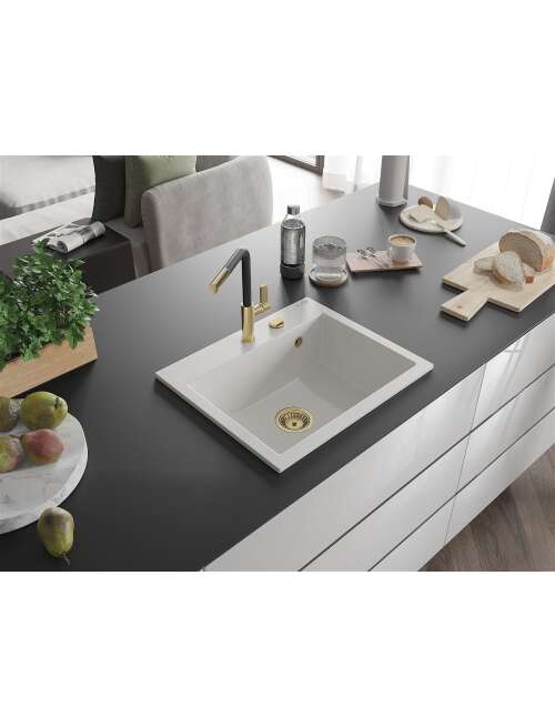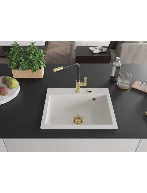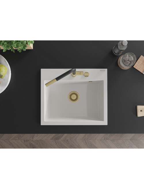 Mexen Oscar zlewozmywak granitowy 1-komorowy 580 x 490 mm, biały, syfon złoty - 6519581000-20-G