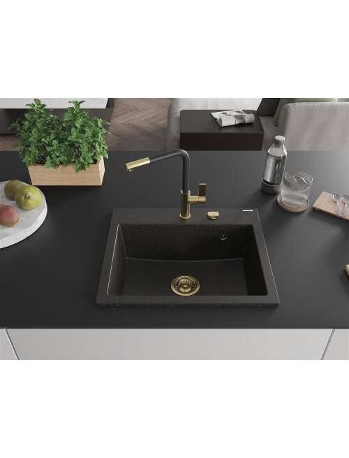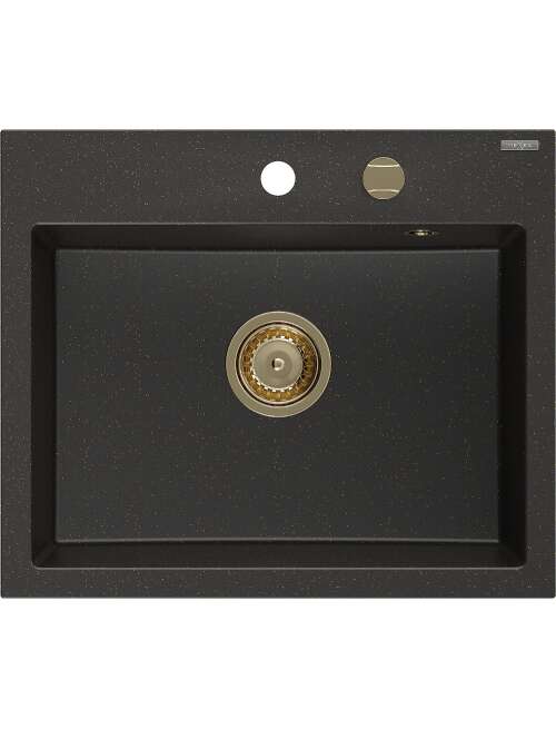 Mexen Oscar zlewozmywak granitowy 1-komorowy 580 x 490 mm, czarny/złoty metalik, syfon złoty - 6519581000-75-G