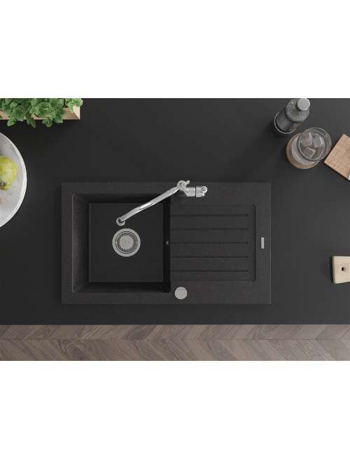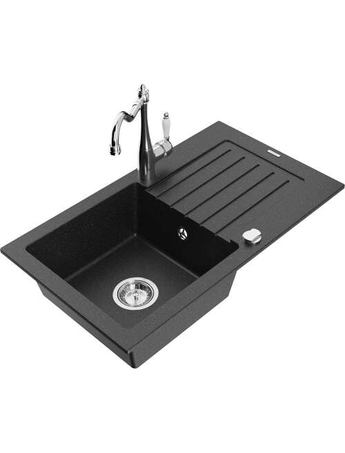 Mexen Pablo zlewozmywak granitowy 1-komorowy z ociekaczem i baterią kuchenną Carla, czarny/srebrny metalik - 6510-73-670700-00