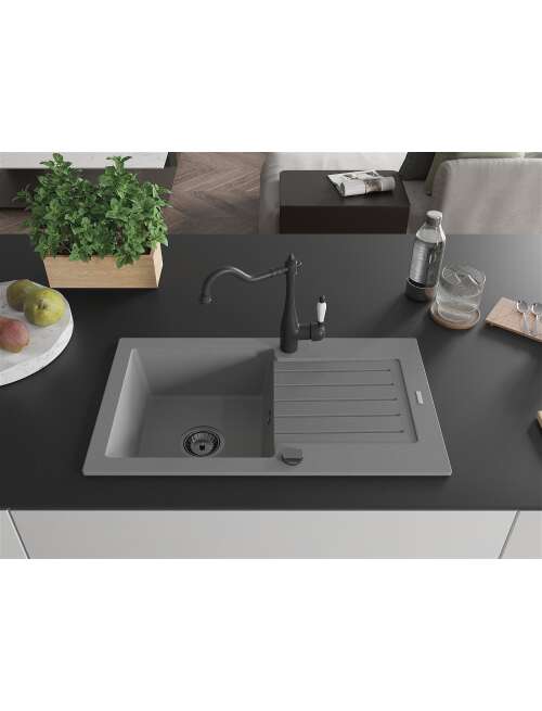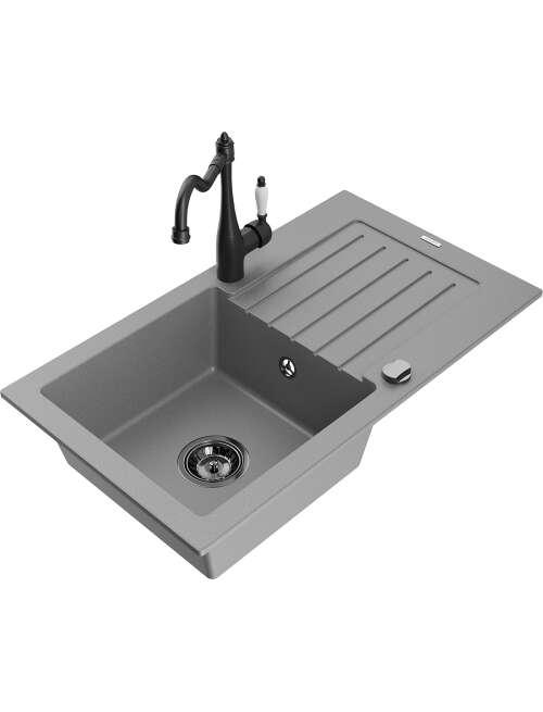Mexen Pablo zlewozmywak granitowy 1-komorowy z ociekaczem i baterią kuchenną Carla, szary - 6510-71-670700-70-B