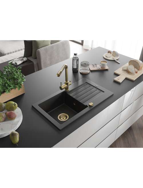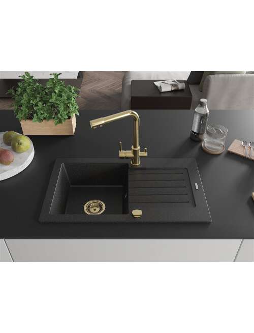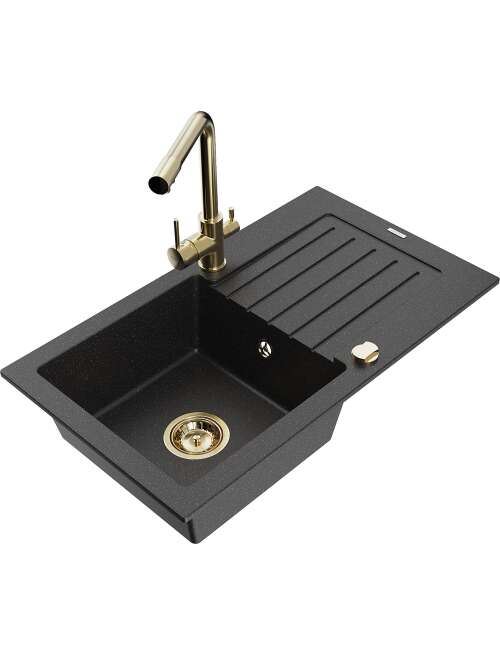 Dane techniczne: Zlewozmywak: Rozmiar: 752x436x161 mm Głębokość komory: 151 mm Wymiary komory: 356x332 mm Średnica odpływu: ø90 mm Typ: 1-komorowy z ociekaczem Rodzaj: Wpuszczany w blat Kolor: Czarny/Srebrny metalik Wykończenie syfonu: Złoty Materiał: Granit (80% kruszywo granitowe 20% żywice) Otwór przelewowy: Tak Otwory: ( bateria, automat ) 2 Montaż: Uniwersalny, możliwość montażu z ociekaczem po lewej lub prawej stronie Wysoka odporność na zarysowania i przebarwienia Odporność na szok termiczny Powierzchnia ułatwiająca czyszczenie Dwa dodatkowe podfrezowane otwory do samodzielnego wybicia ø35 Bateria kuchenna: Materiał: Mosiądz Kolor: Złoty Głowica: Ceramiczna Perlator: Tak Typ: Dwuuchwytowa Zasięg wylewki: 235 mm Wysokość baterii: 315 mm Bateria dwugłowicowa z dodatkowym filtrem do wody pitnej |