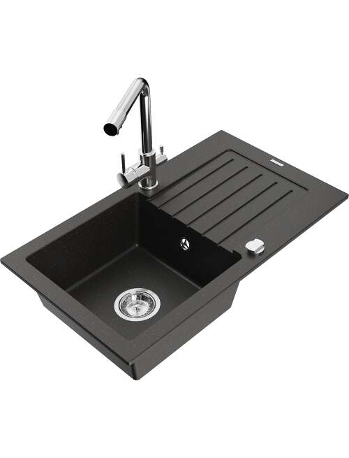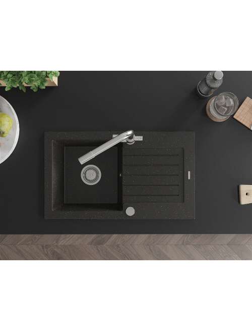Dane techniczne: Zlewozmywak: Rozmiar: 752x436x161 mm Głębokość komory: 151 mm Wymiary komory: 356x332 mm Średnica odpływu: ø90 mm Typ: 1-komorowy z ociekaczem Rodzaj: Wpuszczany w blat Kolor: Czarny/Złoty metalik Wykończenie syfonu: Chrom Materiał: Granit (80% kruszywo granitowe 20% żywice) Otwór przelewowy: Tak Otwory: ( bateria, automat ) 2 Montaż: Uniwersalny, możliwość montażu z ociekaczem po lewej lub prawej stronie Wysoka odporność na zarysowania i przebarwienia Odporność na szok termiczny Powierzchnia ułatwiająca czyszczenie Dwa dodatkowe podfrezowane otwory do samodzielnego wybicia ø35 Bateria kuchenna: Materiał: Mosiądz Kolor: Chrom Głowica: Ceramiczna Perlator: Tak Typ: Dwuuchwytowa Zasięg wylewki: 235 mm Wysokość baterii: 315 mm Bateria dwugłowicowa z dodatkowym filtrem do wody pitnej |