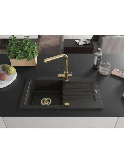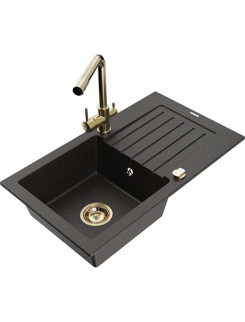Mexen Pablo zlewozmywak granitowy 1-komorowy z ociekaczem i baterią kuchenną Duero, czarny/złoty metalik - 6510-75-671600-50