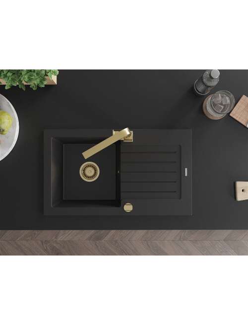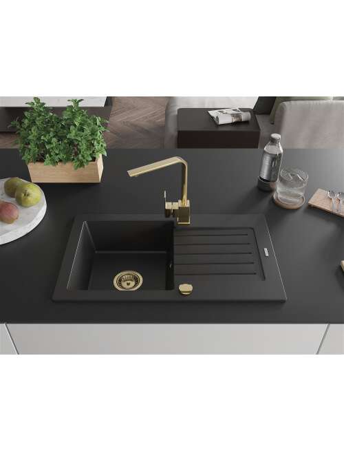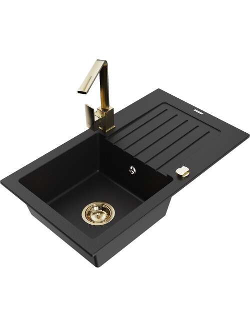 Mexen Pablo zlewozmywak granitowy 1-komorowy z ociekaczem i baterią kuchenną Rita, czarny - 6510-77-670300-50