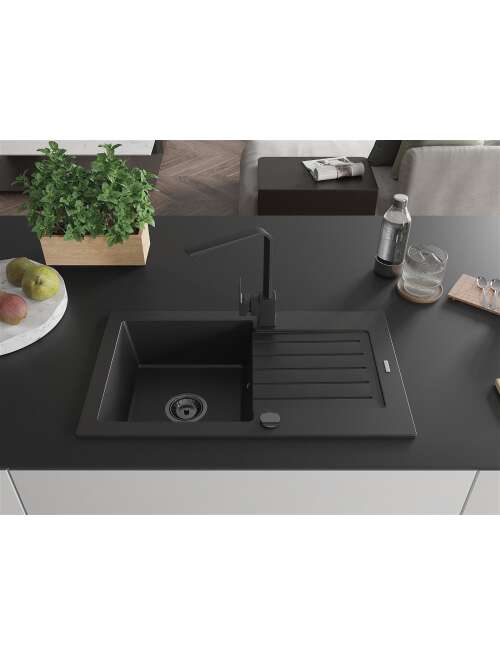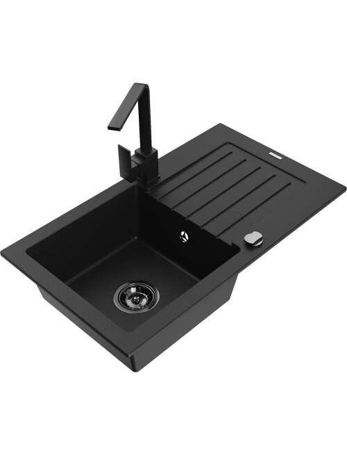 Dane techniczne: Zlewozmywak: Rozmiar: 752x436x161 mm Głębokość komory: 151 mm Wymiary komory: 356x332 mm Średnica odpływu: ø90 mm Typ: 1-komorowy z ociekaczem Rodzaj: Wpuszczany w blat Kolor: Czarny Wykończenie syfonu: Czarny Materiał: Granit (80% kruszywo granitowe 20% żywice) Otwór przelewowy: Tak Otwory: ( bateria, automat ) 2 Montaż: Uniwersalny, możliwość montażu z ociekaczem po lewej lub prawej stronie Wysoka odporność na zarysowania i przebarwienia Odporność na szok termiczny Powierzchnia ułatwiająca czyszczenie Dwa dodatkowe podfrezowane otwory do samodzielnego wybicia ø35 Bateria kuchenna: Materiał: Mosiądz Kolor: Czarny Głowica: Ceramiczna Perlator: Tak Typ: Jednouchwytowa Wysokość baterii: 290 mm Zasięg wylewki: 220 mm |