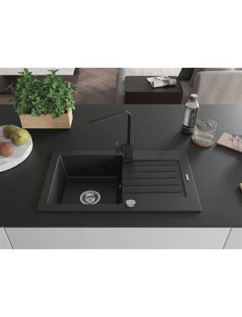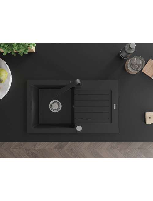 Dane techniczne: Zlewozmywak: Rozmiar: 752x436x161 mm Głębokość komory: 151 mm Wymiary komory: 356x332 mm Średnica odpływu: ø90 mm Typ: 1-komorowy z ociekaczem Rodzaj: Wpuszczany w blat Kolor: Czarny Wykończenie syfonu: Chrom Materiał: Granit (80% kruszywo granitowe 20% żywice) Otwór przelewowy: Tak Otwory: ( bateria, automat ) 2 Montaż: Uniwersalny, możliwość montażu z ociekaczem po lewej lub prawej stronie Wysoka odporność na zarysowania i przebarwienia Odporność na szok termiczny Powierzchnia ułatwiająca czyszczenie Dwa dodatkowe podfrezowane otwory do samodzielnego wybicia ø35 Bateria kuchenna: Materiał: Mosiądz Kolor: Czarny Głowica: Ceramiczna Perlator: Tak Typ: Jednouchwytowa Wysokość baterii: 290 mm Zasięg wylewki: 220 mm |