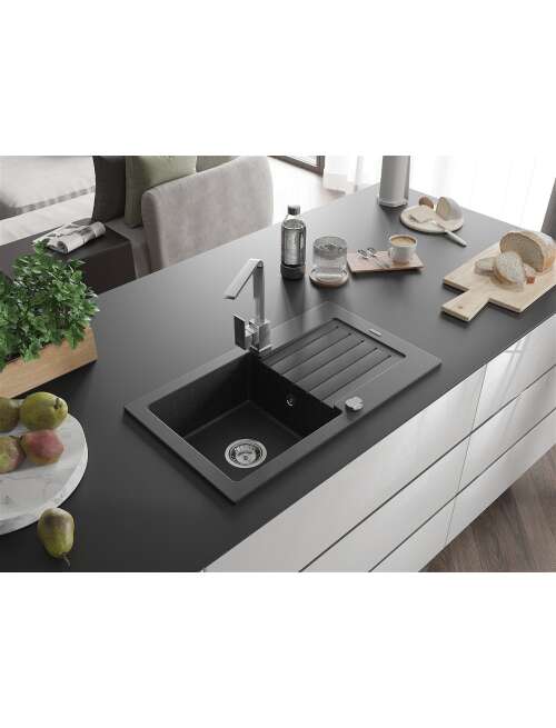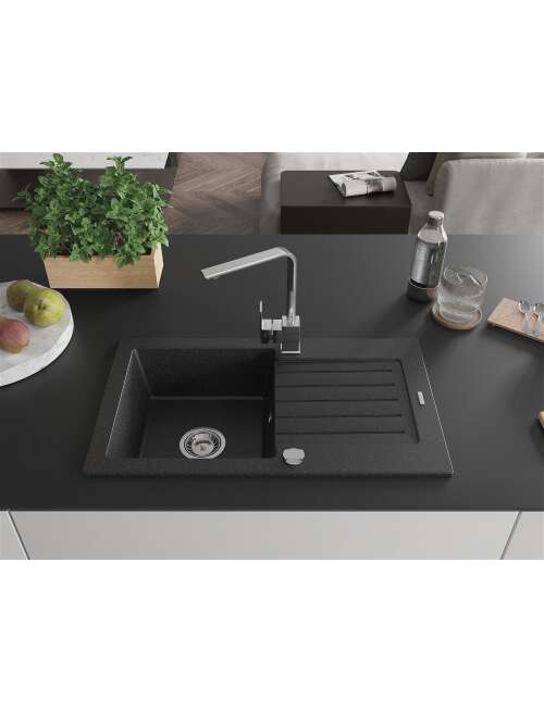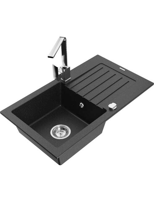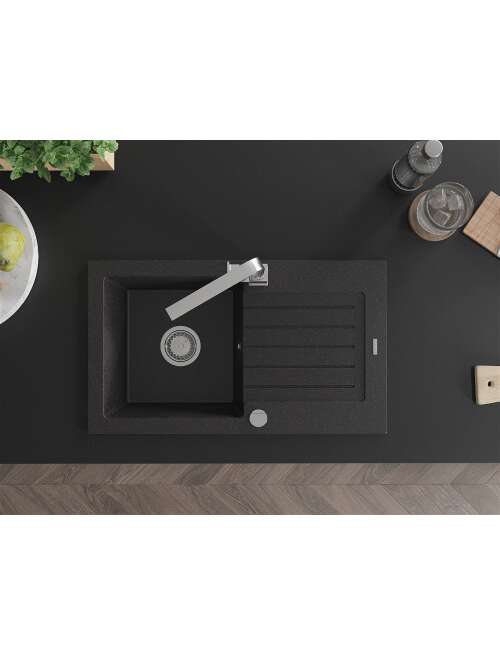 Dane techniczne: Zlewozmywak: Rozmiar: 752x436x161 mm Głębokość komory: 151 mm Wymiary komory: 356x332 mm Średnica odpływu: ø90 mm Typ: 1-komorowy z ociekaczem Rodzaj: Wpuszczany w blat Kolor: Czarny/Srebrny metalik Wykończenie syfonu: Chrom Materiał: Granit (80% kruszywo granitowe 20% żywice) Otwór przelewowy: Tak Otwory: ( bateria, automat ) 2 Montaż: Uniwersalny, możliwość montażu z ociekaczem po lewej lub prawej stronie Wysoka odporność na zarysowania i przebarwienia Odporność na szok termiczny Powierzchnia ułatwiająca czyszczenie Dwa dodatkowe podfrezowane otwory do samodzielnego wybicia ø35 Bateria kuchenna: Materiał: Mosiądz Kolor: Chrom Głowica: Ceramiczna Perlator: Tak Typ: Jednouchwytowa Wysokość baterii: 290 mm Zasięg wylewki: 220 mm |