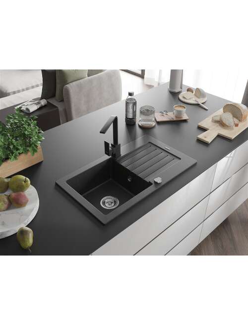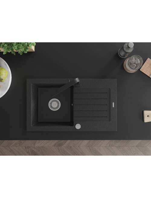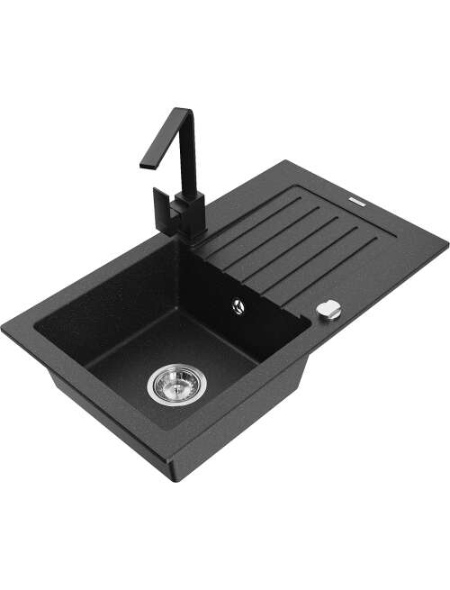 Mexen Pablo zlewozmywak granitowy 1-komorowy z ociekaczem i baterią kuchenną Rita, czarny/srebrny metalik- 6510-73-670300-70