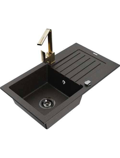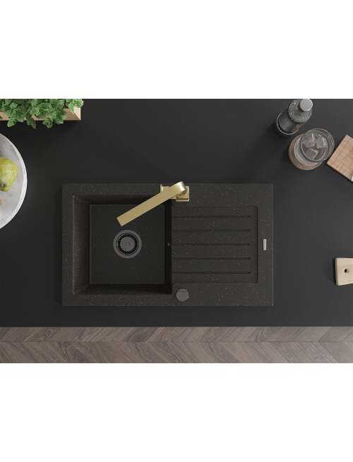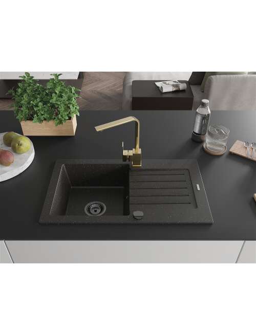 Dane techniczne: Zlewozmywak: Rozmiar: 752x436x161 mm Głębokość komory: 151 mm Wymiary komory: 356x332 mm Średnica odpływu: ø90 mm Typ: 1-komorowy z ociekaczem Rodzaj: Wpuszczany w blat Kolor: Czarny/Złoty metalik Wykończenie syfonu: Czarny Materiał: Granit (80% kruszywo granitowe 20% żywice) Otwór przelewowy: Tak Otwory: ( bateria, automat ) 2 Montaż: Uniwersalny, możliwość montażu z ociekaczem po lewej lub prawej stronie Wysoka odporność na zarysowania i przebarwienia Odporność na szok termiczny Powierzchnia ułatwiająca czyszczenie Dwa dodatkowe podfrezowane otwory do samodzielnego wybicia ø35 Bateria kuchenna: Materiał: Mosiądz Kolor: Złoty Głowica: Ceramiczna Perlator: Tak Typ: Jednouchwytowa Wysokość baterii: 290 mm Zasięg wylewki: 220 mm |