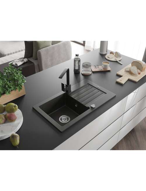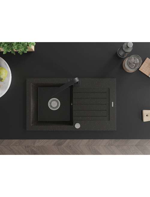 Dane techniczne: Zlewozmywak: Rozmiar: 752x436x161 mm Głębokość komory: 151 mm Wymiary komory: 356x332 mm Średnica odpływu: ø90 mm Typ: 1-komorowy z ociekaczem Rodzaj: Wpuszczany w blat Kolor: Czarny/Złoty metalik Wykończenie syfonu: Chrom Materiał: Granit (80% kruszywo granitowe 20% żywice) Otwór przelewowy: Tak Otwory: ( bateria, automat ) 2 Montaż: Uniwersalny, możliwość montażu z ociekaczem po lewej lub prawej stronie Wysoka odporność na zarysowania i przebarwienia Odporność na szok termiczny Powierzchnia ułatwiająca czyszczenie Dwa dodatkowe podfrezowane otwory do samodzielnego wybicia ø35 Bateria kuchenna: Materiał: Mosiądz Kolor: Czarny Głowica: Ceramiczna Perlator: Tak Typ: Jednouchwytowa Wysokość baterii: 290 mm Zasięg wylewki: 220 mm |