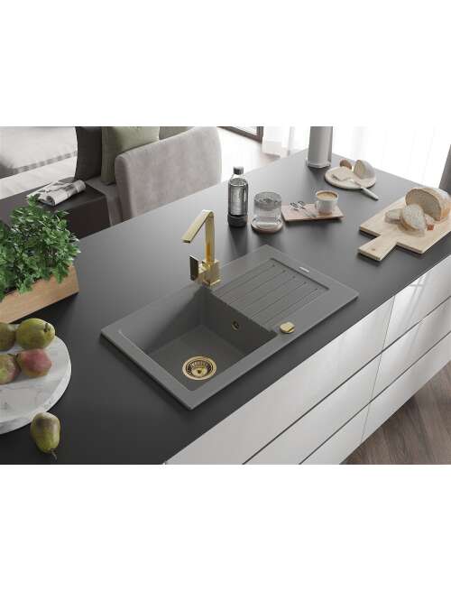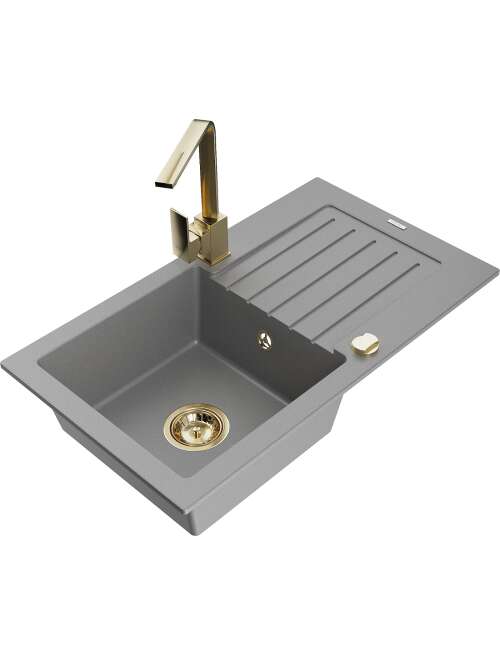 Dane techniczne: Zlewozmywak: Rozmiar: 752x436x161 mm Głębokość komory: 151 mm Wymiary komory: 356x332 mm Średnica odpływu: ø90 mm Typ: 1-komorowy z ociekaczem Rodzaj: Wpuszczany w blat Kolor: Szary Wykończenie syfonu: Złoty Materiał: Granit (80% kruszywo granitowe 20% żywice) Otwór przelewowy: Tak Otwory: ( bateria, automat ) 2 Montaż: Uniwersalny, możliwość montażu z ociekaczem po lewej lub prawej stronie Wysoka odporność na zarysowania i przebarwienia Odporność na szok termiczny Powierzchnia ułatwiająca czyszczenie Dwa dodatkowe podfrezowane otwory do samodzielnego wybicia ø35 Bateria kuchenna: Materiał: Mosiądz Kolor: Złoty Głowica: Ceramiczna Perlator: Tak Typ: Jednouchwytowa Wysokość baterii: 290 mm Zasięg wylewki: 220 mm |