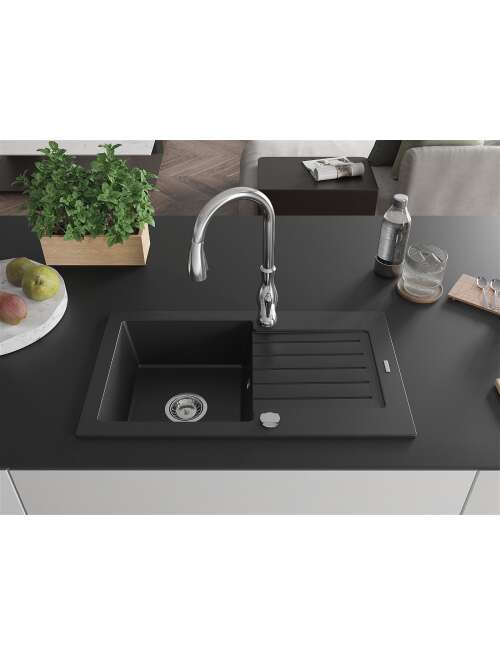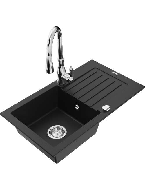Mexen Pablo zlewozmywak granitowy 1-komorowy z ociekaczem i baterią kuchenną Savita, czarny - 6510-77-672601-00