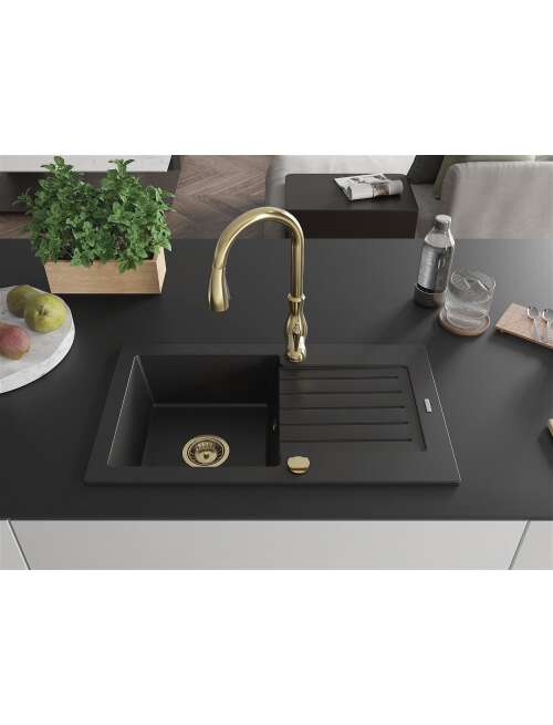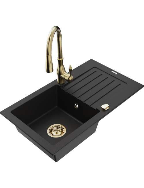 Dane techniczne: Zlewozmywak: Rozmiar: 752x436x161 mm Głębokość komory: 151 mm Wymiary komory: 356x332 mm Średnica odpływu: ø90 mm Typ: 1-komorowy z ociekaczem Rodzaj: Wpuszczany w blat Kolor: Czarny Wykończenie syfonu: Złoty Materiał: Granit (80% kruszywo granitowe 20% żywice) Otwór przelewowy: Tak Otwory: ( bateria, automat ) 2 Montaż: Uniwersalny, możliwość montażu z ociekaczem po lewej lub prawej stronie Wysoka odporność na zarysowania i przebarwienia Odporność na szok termiczny Powierzchnia ułatwiająca czyszczenie Dwa dodatkowe podfrezowane otwory do samodzielnego wybicia ø35 Bateria kuchenna: Materiał: Mosiądz Kolor: Złoty Głowica: Ceramiczna Perlator: Tak Typ: Jednouchwytowa Wysokość baterii: 410 mm Zasięg wylewki: 231 mm |