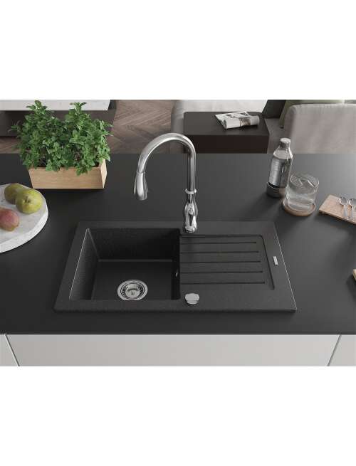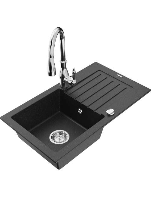 Mexen Pablo zlewozmywak granitowy 1-komorowy z ociekaczem i baterią kuchenną Savita, czarny/srebrny metalik - 6510-73-672601-00