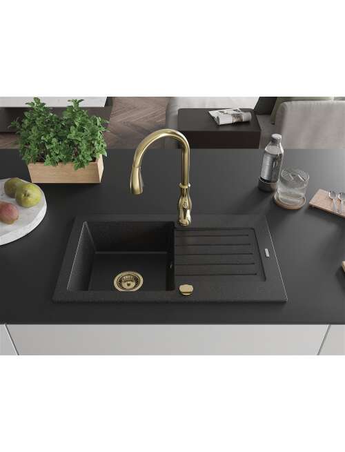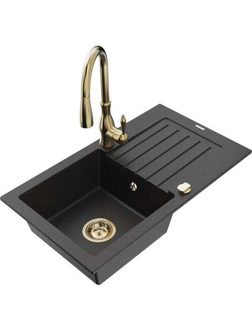 Mexen Pablo zlewozmywak granitowy 1-komorowy z ociekaczem i baterią kuchenną Savita, czarny/srebrny metalik - 6510-73-672601-50