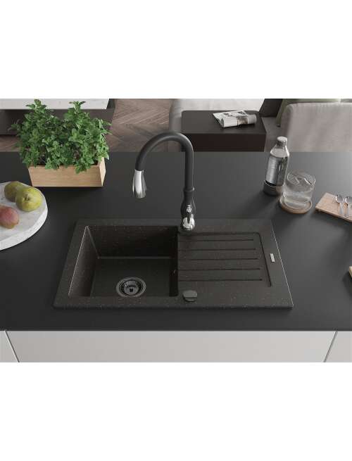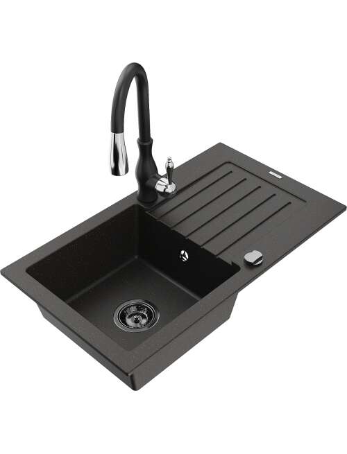Dane techniczne: Zlewozmywak: Rozmiar: 752x436x161 mm Głębokość komory: 151 mm Wymiary komory: 356x332 mm Średnica odpływu: ø90 mm Typ: 1-komorowy z ociekaczem Rodzaj: Wpuszczany w blat Kolor: Czarny/Złoty metalik Wykończenie syfonu: Czarny Materiał: Granit (80% kruszywo granitowe 20% żywice) Otwór przelewowy: Tak Otwory: ( bateria, automat ) 2 Montaż: Uniwersalny, możliwość montażu z ociekaczem po lewej lub prawej stronie Wysoka odporność na zarysowania i przebarwienia Odporność na szok termiczny Powierzchnia ułatwiająca czyszczenie Dwa dodatkowe podfrezowane otwory do samodzielnego wybicia ø35 Bateria kuchenna: Materiał: Mosiądz Kolor: Czarny Głowica: Ceramiczna Perlator: Tak Typ: Jednouchwytowa Wysokość baterii: 410 mm Zasięg wylewki: 231 mm |