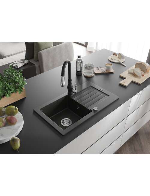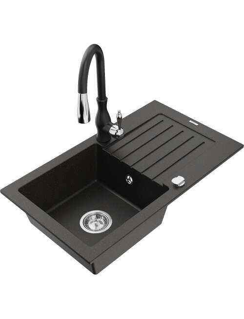 Dane techniczne: Zlewozmywak: Rozmiar: 752x436x161 mm Głębokość komory: 151 mm Wymiary komory: 356x332 mm Średnica odpływu: ø90 mm Typ: 1-komorowy z ociekaczem Rodzaj: Wpuszczany w blat Kolor: Czarny/Złoty metalik Wykończenie syfonu: Chrom Materiał: Granit (80% kruszywo granitowe 20% żywice) Otwór przelewowy: Tak Otwory: ( bateria, automat ) 2 Montaż: Uniwersalny, możliwość montażu z ociekaczem po lewej lub prawej stronie Wysoka odporność na zarysowania i przebarwienia Odporność na szok termiczny Powierzchnia ułatwiająca czyszczenie Dwa dodatkowe podfrezowane otwory do samodzielnego wybicia ø35 Bateria kuchenna: Materiał: Mosiądz Kolor: Czarny Głowica: Ceramiczna Perlator: Tak Typ: Jednouchwytowa Wysokość baterii: 410 mm Zasięg wylewki: 231 mm |