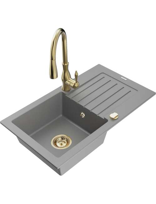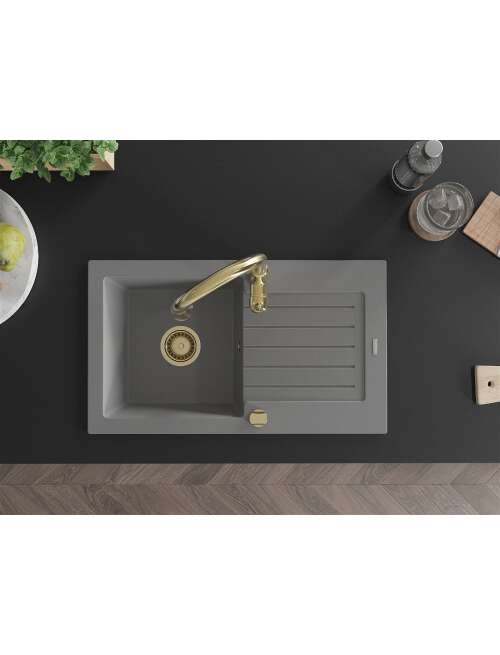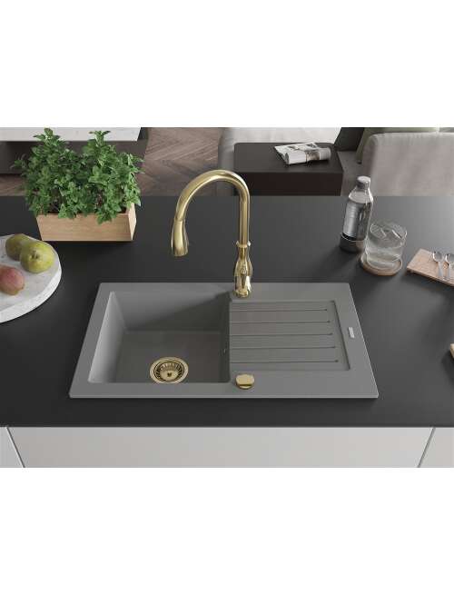 Dane techniczne: Zlewozmywak: Rozmiar: 752x436x161 mm Głębokość komory: 151 mm Wymiary komory: 356x332 mm Średnica odpływu: ø90 mm Typ: 1-komorowy z ociekaczem Rodzaj: Wpuszczany w blat Kolor: Szary Wykończenie syfonu: Złoty Materiał: Granit (80% kruszywo granitowe 20% żywice) Otwór przelewowy: Tak Otwory: ( bateria, automat ) 2 Montaż: Uniwersalny, możliwość montażu z ociekaczem po lewej lub prawej stronie Wysoka odporność na zarysowania i przebarwienia Odporność na szok termiczny Powierzchnia ułatwiająca czyszczenie Dwa dodatkowe podfrezowane otwory do samodzielnego wybicia ø35 Bateria kuchenna: Materiał: Mosiądz Kolor: Złoty Głowica: Ceramiczna Perlator: Tak Typ: Jednouchwytowa Wysokość baterii: 410 mm Zasięg wylewki: 231 mm |