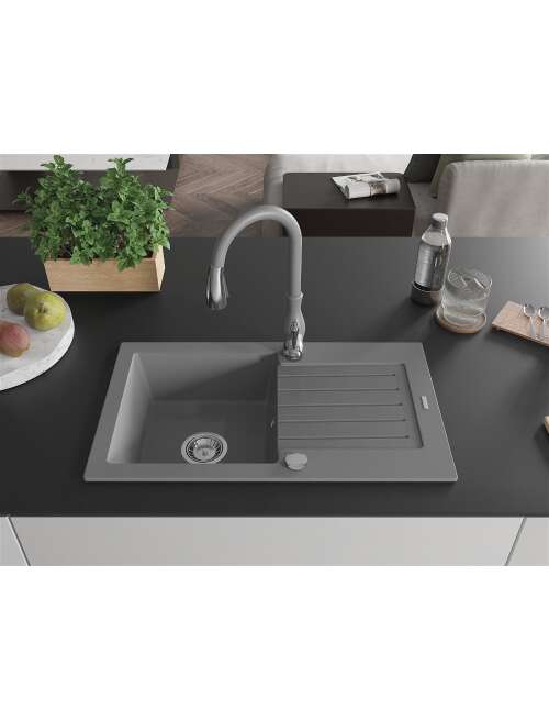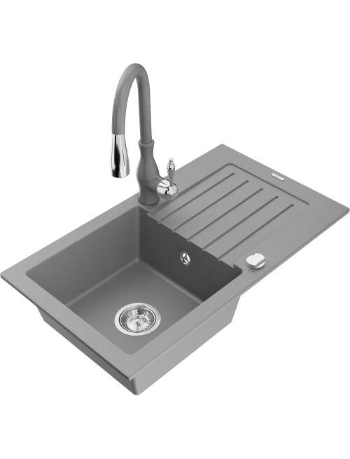 Dane techniczne: Zlewozmywak: Rozmiar: 752x436x161 mm Głębokość komory: 151 mm Wymiary komory: 356x332 mm Średnica odpływu: ø90 mm Typ: 1-komorowy z ociekaczem Rodzaj: Wpuszczany w blat Kolor: Szary Wykończenie syfonu: Chrom Materiał: Granit (80% kruszywo granitowe 20% żywice) Otwór przelewowy: Tak Otwory: ( bateria, automat ) 2 Montaż: Uniwersalny, możliwość montażu z ociekaczem po lewej lub prawej stronie Wysoka odporność na zarysowania i przebarwienia Odporność na szok termiczny Powierzchnia ułatwiająca czyszczenie Dwa dodatkowe podfrezowane otwory do samodzielnego wybicia ø35 Bateria kuchenna: Materiał: Mosiądz Kolor: Szary Głowica: Ceramiczna Perlator: Tak Typ: Jednouchwytowa Wysokość baterii: 410 mm Zasięg wylewki: 231 mm |