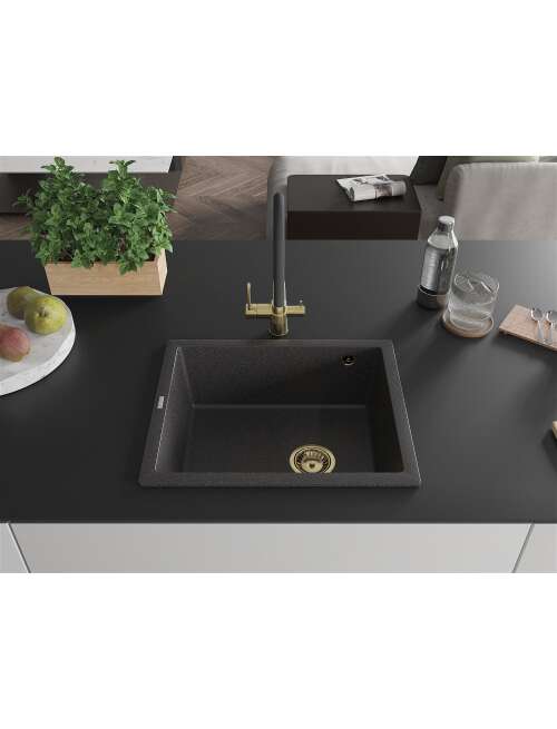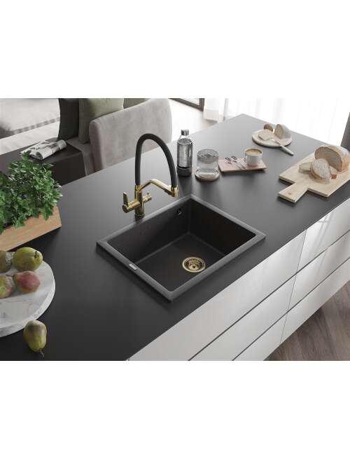 Dane techniczne: Rozmiar: 560x460x200 mm Głębokość komory: 190 mm Wymiary komory: 500x400 mm Średnica odpływu: ø90 mm Typ: 1-komorowy Rodzaj: Wpuszczany w blat, Podblatowy Materiał: Granit Kolor: Czarny nakrapiany Wykończenie syfonu: Złoty Otwór przelewowy: Tak Otwór na baterie: Nie Syfon manualny w komplecie Wysoka odporność na zarysowania i przebarwienia Odporność na szok termiczny Powierzchnia ułatwiająca czyszczenie |