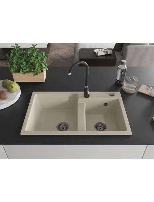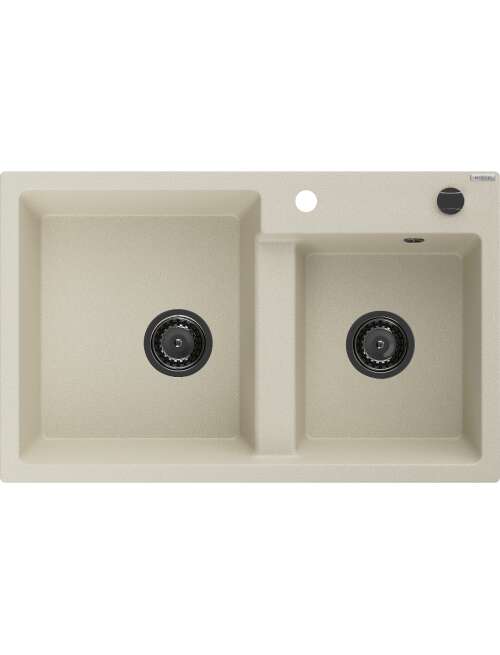Dane techniczne: Rozmiar: 800x500x190 mm Głębokość komory: 180 mm (większa), 180 mm (mniejsza) Wymiary komory: 440x387 mm (większa), 370x303 mm (mniejsza) Średnica odpływu: ø90 mm Rodzaj: 2-komorowy Typ: Wpuszczany w blat Materiał: Granit Kolor: Beżowy Wykończenie syfonu: Czarny Otwór przelewowy: Tak Otwór na baterie: Tak Syfon automatyczny w komplecie Wysoka odporność na zarysowania i przebarwienia Odporność na szok termiczny Powierzchnia ułatwiająca czyszczenie Jeden dodatkowy podfrezowany otwór do samodzielnego wybicia ø35 |