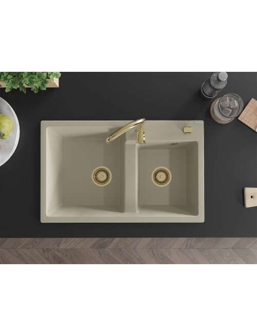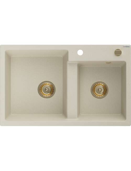 Mexen Tomas zlewozmywak granitowy 2-komorowy 800 x 500 mm, beżowy, syfon złoty - 6516802000-69-G