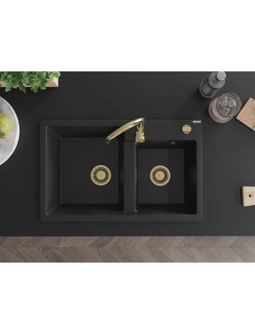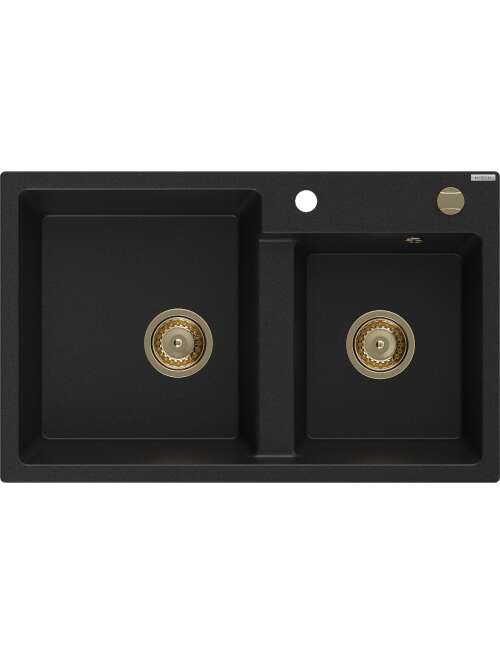 Mexen Tomas zlewozmywak granitowy 2-komorowy 800 x 500 mm, czarny, syfon złoty - 6516802000-77-G