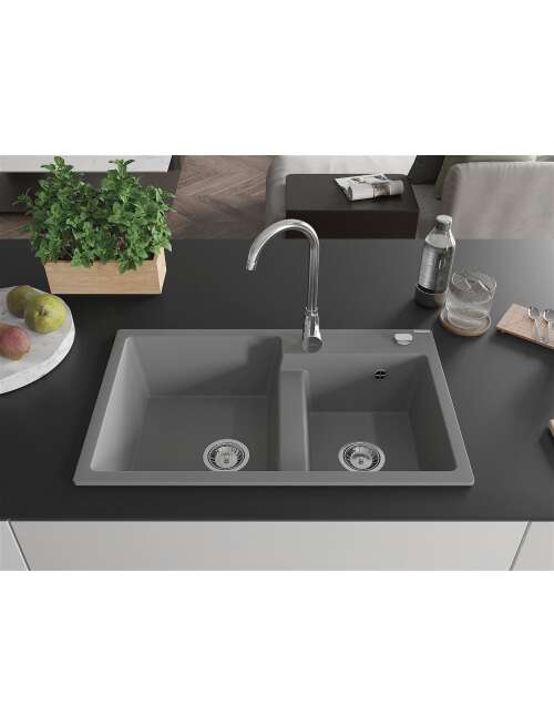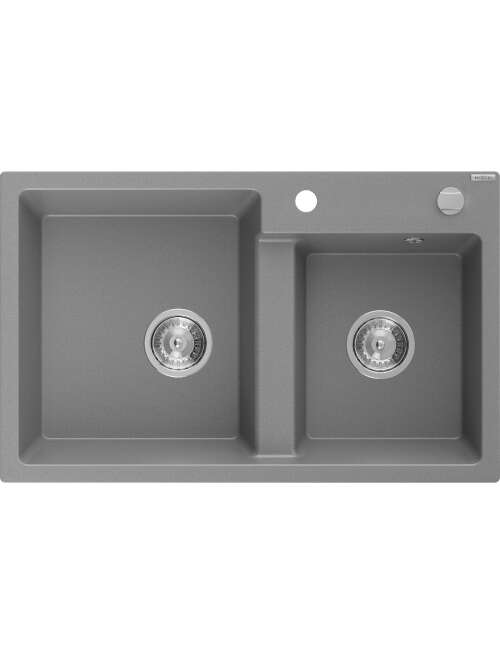 Dane techniczne: Rozmiar: 800x500x190 mm Głębokość komory: 180 mm (większa), 180 mm (mniejsza) Wymiary komory: 440x387 mm (większa), 370x303 mm (mniejsza) Średnica odpływu: ø90 mm Rodzaj: 2-komorowy Typ: Wpuszczany w blat Materiał: Granit Kolor: Szary Wykończenie syfonu: Chrom Otwór przelewowy: Tak Otwór na baterie: Tak Syfon automatyczny w komplecie Wysoka odporność na zarysowania i przebarwienia Odporność na szok termiczny Powierzchnia ułatwiająca czyszczenie Jeden dodatkowy podfrezowany otwór do samodzielnego wybicia ø35 |