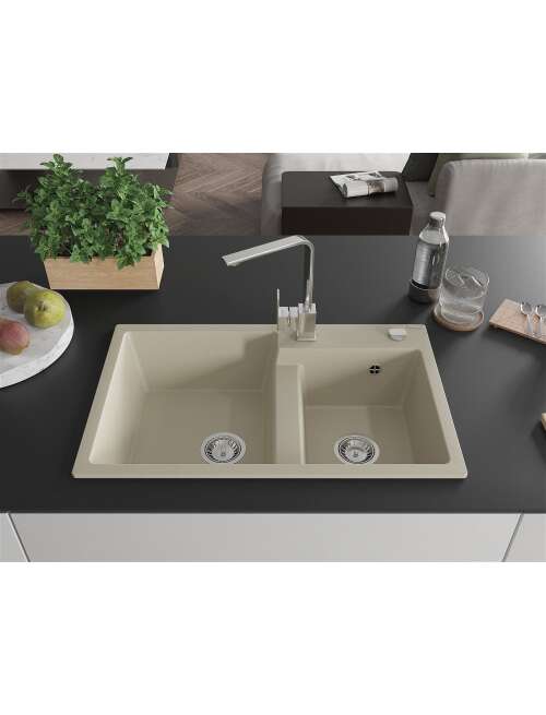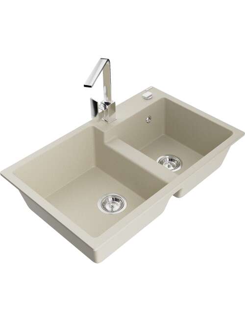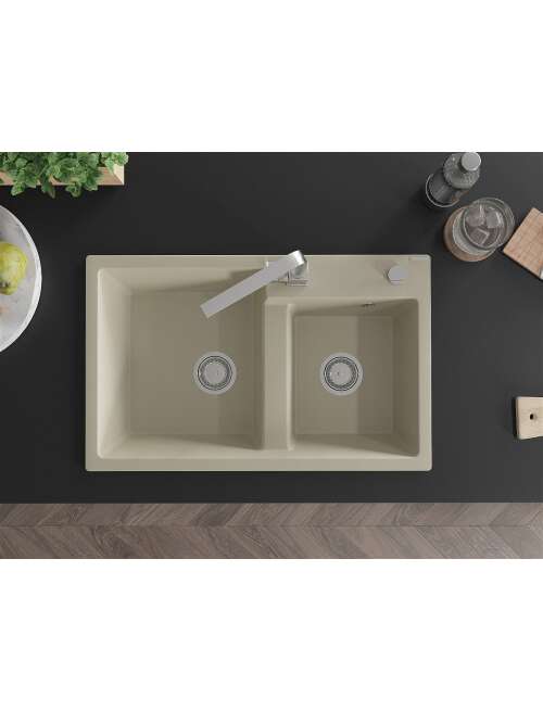 Dane techniczne: Zlewozmywak: Rozmiar: 800x500x190 mm Głębokość komory: 180 mm (większa), 180 mm (mniejsza) Wymiary komory: 440x387 mm (większa), 370x303 mm (mniejsza) Średnica odpływu: ø90 mm Rodzaj: 2-komorowy Typ: Wpuszczany w blat Materiał: Granit Kolor: Beżowy Wykończenie syfonu: Chrom Materiał: Granit (80% kruszywo granitowe 20% żywice) Otwór przelewowy: Tak Otwory: ( bateria, automat ) 2 Montaż: Uniwersalny, możliwość montażu z ociekaczem po lewej lub prawej stronie Wysoka odporność na zarysowania i przebarwienia Odporność na szok termiczny Powierzchnia ułatwiająca czyszczenie Jeden dodatkowy podfrezowany otwór do samodzielnego wybicia ø35 Bateria kuchenna: Materiał: Mosiądz Kolor: Chrom Głowica: Ceramiczna Perlator: Tak Typ: Jednouchwytowa Wysokość baterii: 290 mm Zasięg wylewki: 220 mm |