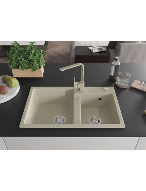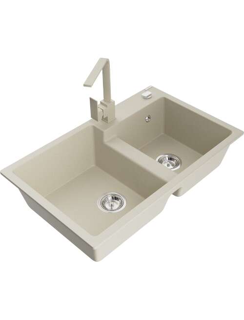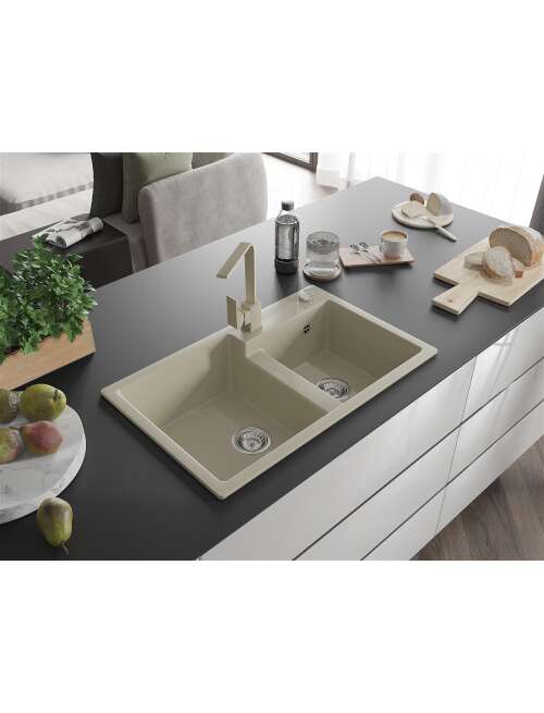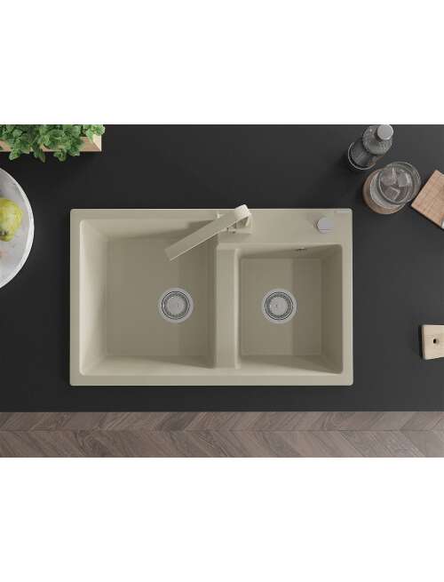 Dane techniczne: Zlewozmywak: Rozmiar: 800x500x190 mm Głębokość komory: 180 mm (większa), 180 mm (mniejsza) Wymiary komory: 440x387 mm (większa), 370x303 mm (mniejsza) Średnica odpływu: ø90 mm Rodzaj: 2-komorowy Typ: Wpuszczany w blat Materiał: Granit Kolor: Beżowy Wykończenie syfonu: Chrom Materiał: Granit (80% kruszywo granitowe 20% żywice) Otwór przelewowy: Tak Otwory: ( bateria, automat ) 2 Wysoka odporność na zarysowania i przebarwienia Odporność na szok termiczny Powierzchnia ułatwiająca czyszczenie Jeden dodatkowy podfrezowany otwór do samodzielnego wybicia ø35 Bateria kuchenna: Materiał: Mosiądz Kolor: Beżowy Głowica: Ceramiczna Perlator: Tak Typ: Jednouchwytowa Wysokość baterii: 290 mm Zasięg wylewki: 220 mm |