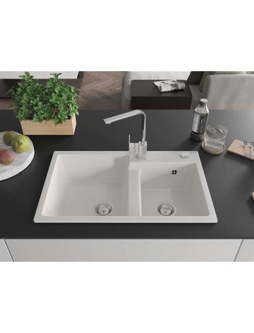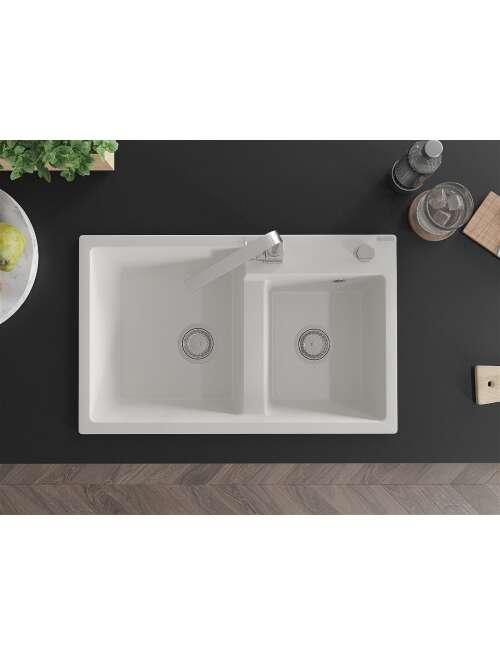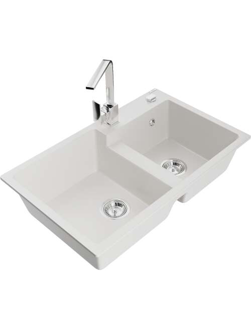 Dane techniczne: Zlewozmywak: Rozmiar: 800x500x190 mm Głębokość komory: 180 mm (większa), 180 mm (mniejsza) Wymiary komory: 440x387 mm (większa), 370x303 mm (mniejsza) Średnica odpływu: ø90 mm Rodzaj: 2-komorowy Typ: Wpuszczany w blat Materiał: Granit Kolor: Biały Wykończenie syfonu: Chrom Materiał: Granit (80% kruszywo granitowe 20% żywice) Otwór przelewowy: Tak Otwory: ( bateria, automat ) 2 Wysoka odporność na zarysowania i przebarwienia Odporność na szok termiczny Powierzchnia ułatwiająca czyszczenie Jeden dodatkowy podfrezowany otwór do samodzielnego wybicia ø35 Bateria kuchenna: Materiał: Mosiądz Kolor: Chrom Głowica: Ceramiczna Perlator: Tak Typ: Jednouchwytowa Wysokość baterii: 290 mm Zasięg wylewki: 220 mm |