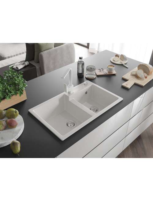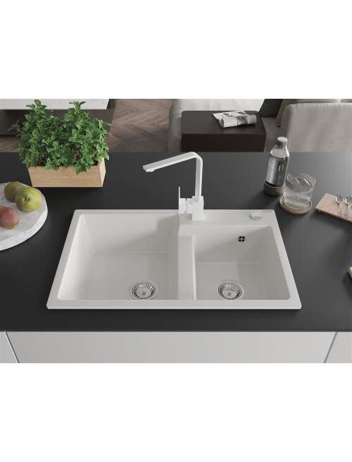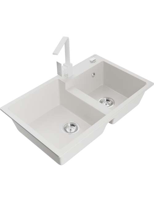 Mexen Tomas zlewozmywak granitowy 2-komorowy z baterią kuchenną Rita, biały - 6516-20-670300-20