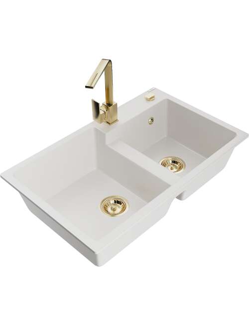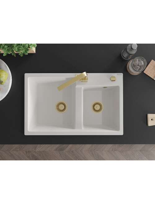 Mexen Tomas zlewozmywak granitowy 2-komorowy z baterią kuchenną Rita, biały - 6516-20-670300-50