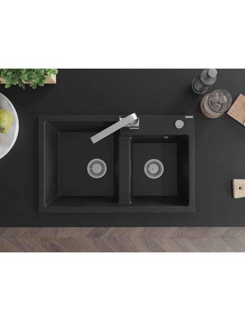 Mexen Tomas zlewozmywak granitowy 2-komorowy z baterią kuchenną Rita, czarny - 6516-77-670300-00