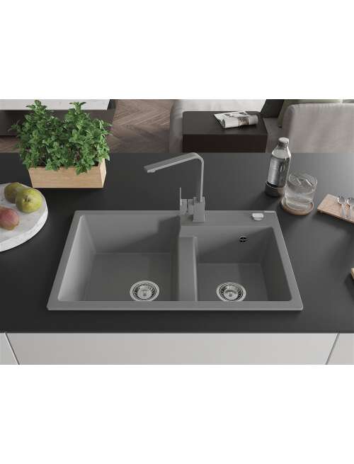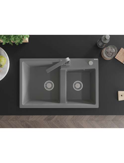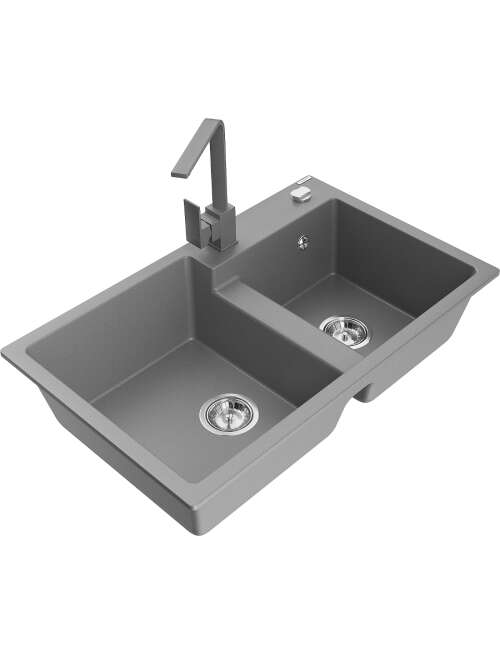 Dane techniczne: Zlewozmywak: Rozmiar: 800x500x190 mm Głębokość komory: 180 mm (większa), 180 mm (mniejsza) Wymiary komory: 440x387 mm (większa), 370x303 mm (mniejsza) Średnica odpływu: ø90 mm Rodzaj: 2-komorowy Typ: Wpuszczany w blat Materiał: Granit Kolor: Szary Wykończenie syfonu: Chrom Materiał: Granit (80% kruszywo granitowe 20% żywice) Otwór przelewowy: Tak Otwory: ( bateria, automat ) 2 Wysoka odporność na zarysowania i przebarwienia Odporność na szok termiczny Powierzchnia ułatwiająca czyszczenie Jeden dodatkowy podfrezowany otwór do samodzielnego wybicia ø35 Bateria kuchenna: Materiał: Mosiądz Kolor: Szary Głowica: Ceramiczna Perlator: Tak Typ: Jednouchwytowa Wysokość baterii: 290 mm Zasięg wylewki: 220 mm |