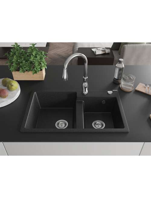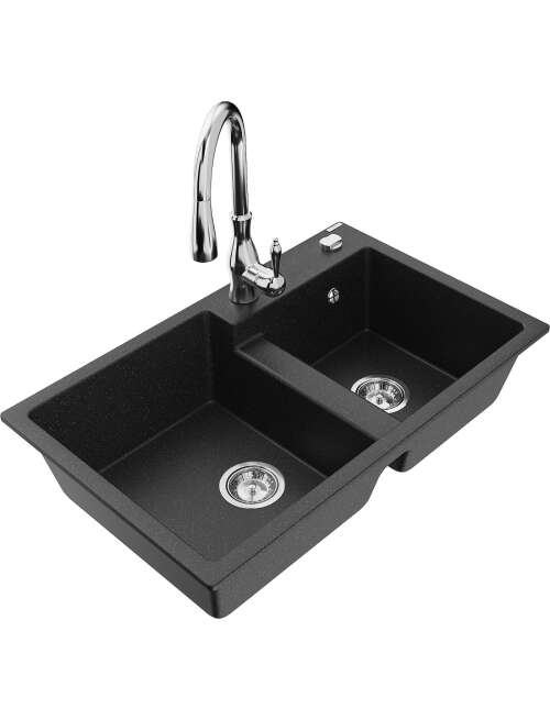 Dane techniczne: Zlewozmywak: Rozmiar: 800x500x190 mm Głębokość komory: 180 mm (większa), 180 mm (mniejsza) Wymiary komory: 440x387 mm (większa), 370x303 mm (mniejsza) Średnica odpływu: ø90 mm Typ: 2-komorowy Rodzaj: Wpuszczany w blat Kolor: Czarny/Srebrny metalik Wykończenie syfonu: Chrom Materiał: Granit (80% kruszywo granitowe 20% żywice) Otwór przelewowy: Tak Otwory: ( bateria, automat ) 2 Wysoka odporność na zarysowania i przebarwienia Odporność na szok termiczny Powierzchnia ułatwiająca czyszczenie Jeden dodatkowy podfrezowany otwór do samodzielnego wybicia ø35 Bateria kuchenna: Materiał: Mosiądz Kolor: Chrom Głowica: Ceramiczna Perlator: Tak Typ: Jednouchwytowa Wysokość baterii: 410 mm Zasięg wylewki: 231 mm |
