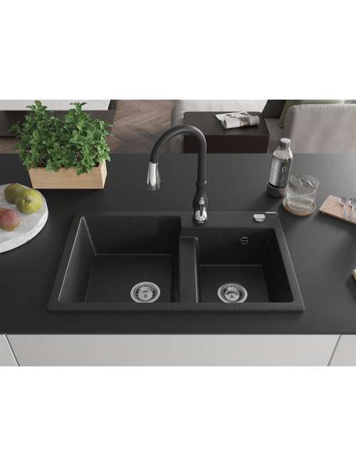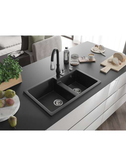 Mexen Tomas zlewozmywak granitowy 2-komorowy z baterią kuchenną Savita, czarny/srebrny metalik - 6516-73-672601-70