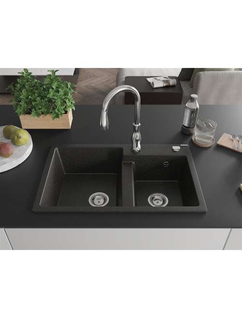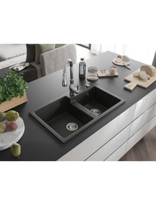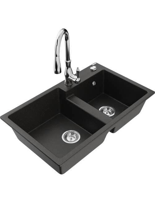 Mexen Tomas zlewozmywak granitowy 2-komorowy z baterią kuchenną Savita, czarny/złoty metalik - 6516-75-672601-00
