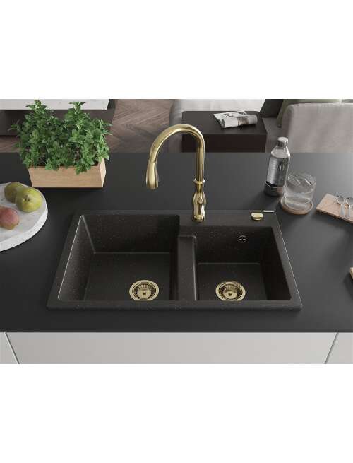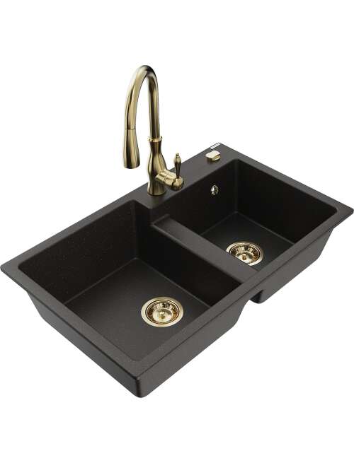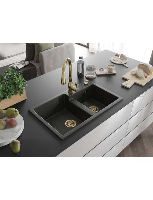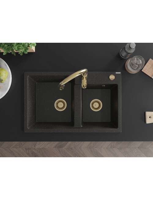 Dane techniczne: Zlewozmywak: Rozmiar: 800x500x190 mm Głębokość komory: 180 mm (większa), 180 mm (mniejsza) Wymiary komory: 440x387 mm (większa), 370x303 mm (mniejsza) Średnica odpływu: ø90 mm Typ: 2-komorowy Rodzaj: Wpuszczany w blat Kolor: Czarny/Złoty metalik Wykończenie syfonu: Złoty Materiał: Granit (80% kruszywo granitowe 20% żywice) Otwór przelewowy: Tak Otwory: ( bateria, automat ) 2 Wysoka odporność na zarysowania i przebarwienia Odporność na szok termiczny Powierzchnia ułatwiająca czyszczenie Jeden dodatkowy podfrezowany otwór do samodzielnego wybicia ø35 Bateria kuchenna: Materiał: Mosiądz Kolor: Złoty Głowica: Ceramiczna Perlator: Tak Typ: Jednouchwytowa Wysokość baterii: 410 mm Zasięg wylewki: 231 mm |