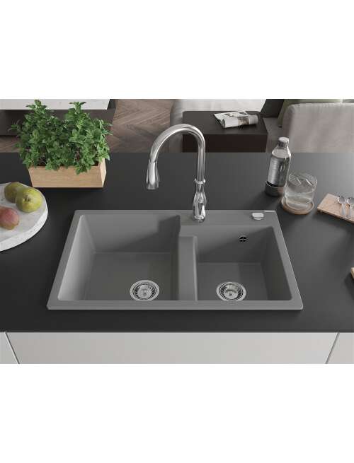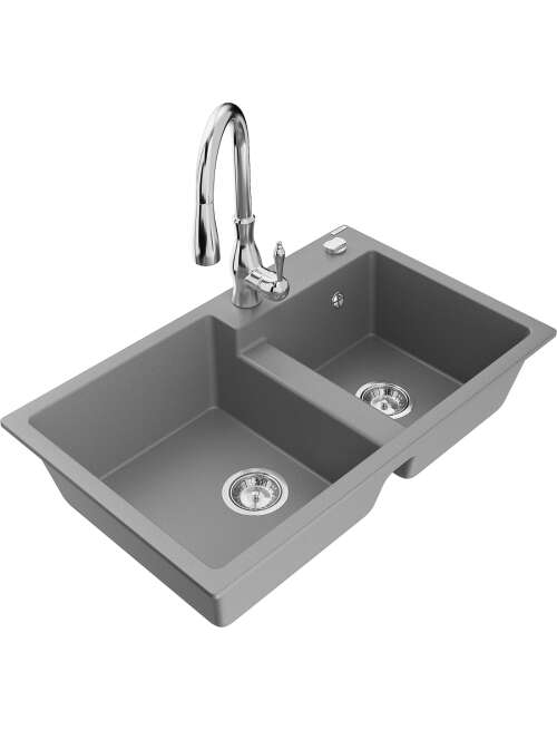 Dane techniczne: Zlewozmywak: Rozmiar: 800x500x190 mm Głębokość komory: 180 mm (większa), 180 mm (mniejsza) Wymiary komory: 440x387 mm (większa), 370x303 mm (mniejsza) Średnica odpływu: ø90 mm Typ: 2-komorowy Rodzaj: Wpuszczany w blat Kolor: Szary Wykończenie syfonu: Chrom Materiał: Granit (80% kruszywo granitowe 20% żywice) Otwór przelewowy: Tak Otwory: ( bateria, automat ) 2 Wysoka odporność na zarysowania i przebarwienia Odporność na szok termiczny Powierzchnia ułatwiająca czyszczenie Jeden dodatkowy podfrezowany otwór do samodzielnego wybicia ø35 Bateria kuchenna: Materiał: Mosiądz Kolor: Chrom Głowica: Ceramiczna Perlator: Tak Typ: Jednouchwytowa Wysokość baterii: 410 mm Zasięg wylewki: 231 mm |