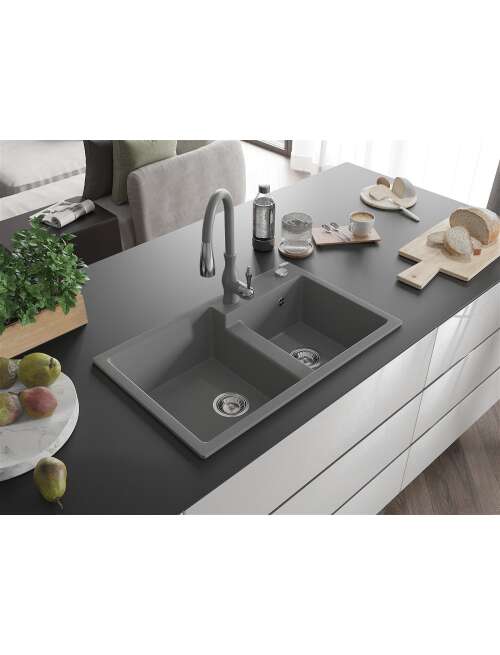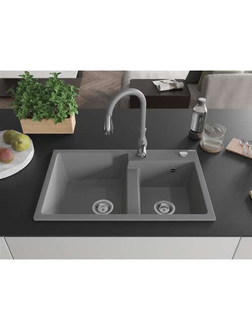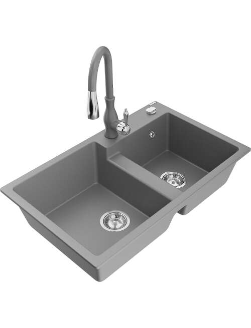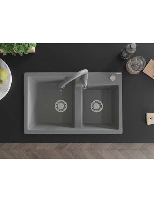 Dane techniczne: Zlewozmywak: Rozmiar: 800x500x190 mm Głębokość komory: 180 mm (większa), 180 mm (mniejsza) Wymiary komory: 440x387 mm (większa), 370x303 mm (mniejsza) Średnica odpływu: ø90 mm Typ: 2-komorowy Rodzaj: Wpuszczany w blat Kolor: Szary Wykończenie syfonu: Chrom Materiał: Granit (80% kruszywo granitowe 20% żywice) Otwór przelewowy: Tak Otwory: ( bateria, automat ) 2 Wysoka odporność na zarysowania i przebarwienia Odporność na szok termiczny Powierzchnia ułatwiająca czyszczenie Jeden dodatkowy podfrezowany otwór do samodzielnego wybicia ø35 Bateria kuchenna: Materiał: Mosiądz Kolor: Szary Głowica: Ceramiczna Perlator: Tak Typ: Jednouchwytowa Wysokość baterii: 410 mm Zasięg wylewki: 231 mm |