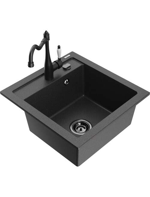 Dane techniczne: Zlewozmywak: Rozmiar: 520x490x210 mm Głębokość komory: 200 mm Wymiary komory: 410x360 mm Średnica odpływu: ø90 mm Typ: 1-komorowy Rodzaj: Wpuszczany w blat Kolor: Czarny nakrapiany Wykończenie syfonu: Czarny Materiał: Granit (80% kruszywo granitowe 20% żywice) Otwór przelewowy: Tak Otwory: ( bateria, automat ) 2 Wysoka odporność na zarysowania i przebarwienia Odporność na szok termiczny Powierzchnia ułatwiająca czyszczenie Jeden dodatkowy podfrezowany otwór do samodzielnego wybicia ø35 Bateria kuchenna: Materiał: Mosiądz Kolor: Czarny Głowica: Ceramiczna Perlator: Tak Typ: Jednouchwytowa Wysokość baterii: 290 mm Zasięg wylewki: 260 mm |